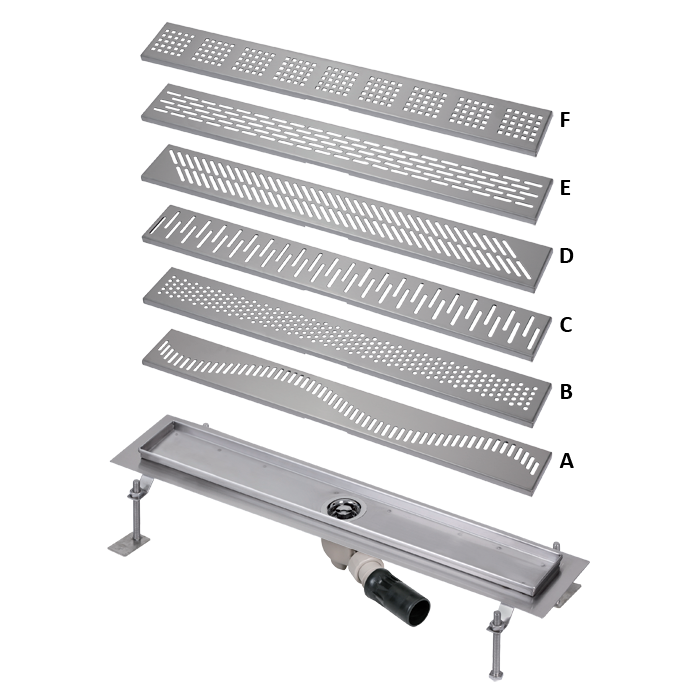 drain, siphon, mounting legs with M10 screw (4 pcs.), tool for grid remove, waterproofing tape, mounting set