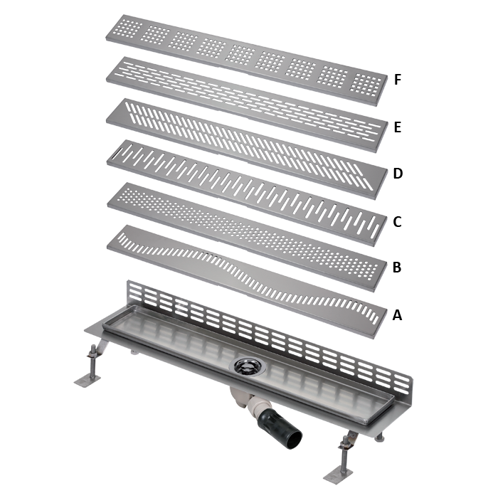drain, siphon, mounting legs with M10 screw (4 pcs.), tool for grid remove, waterproofing tape, mounting set
