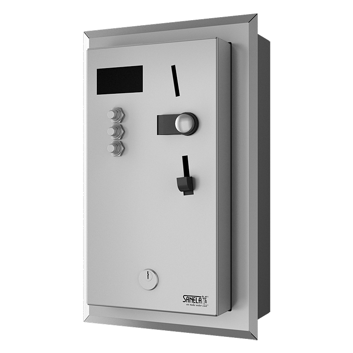 Recessed coin and token shower timer for one to three showers, 24 V DC, choice of shower by the machine, interactive control