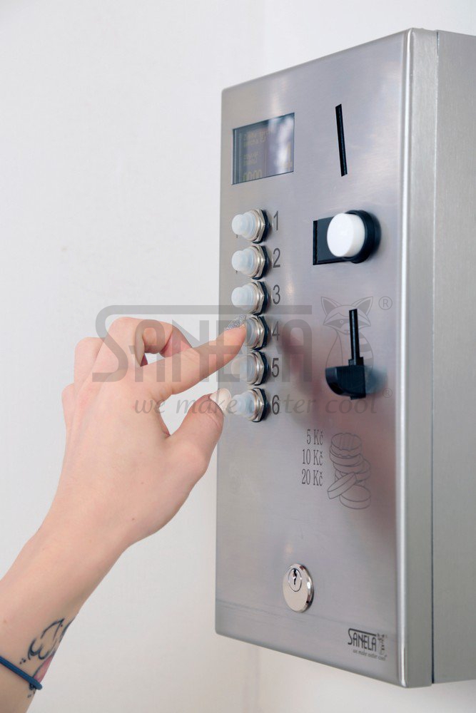 - parameters adjustment using by the remote control SLD 05 (adjustment of shower time according to the thrown coin or token, time value, current euro exchange, token value, display contrast, possibility switch off some from showers)